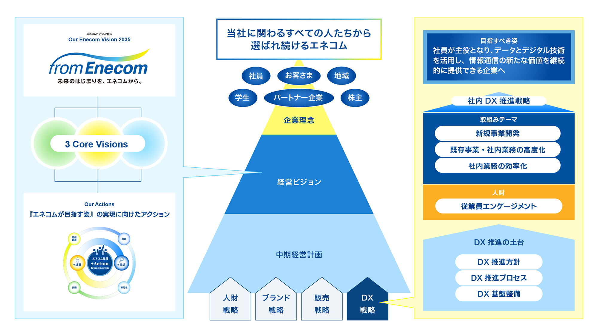 2025年 1月には、当社の新たな経営ビジョン「エネコムビジョン 2035」を 策定。2035年度に「エネコムが目指す姿」の実現に向けて、「DX事業推進本部」を新設し、社内外のDXを一体となって取り組む体制へと明確化しました。