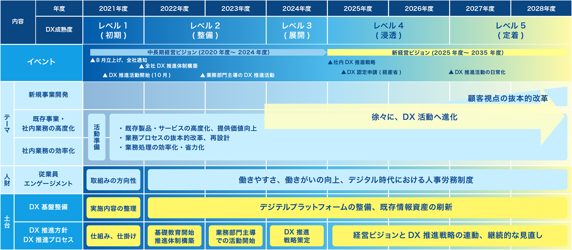| サステナビリティへ取り組む | 社員がいきいきと誇りをもって働き、DX人財の教育・育成を通じ能力を高め、DX推進活動の取り組みを通じて、社会やお客さまの変革を支援します。 |