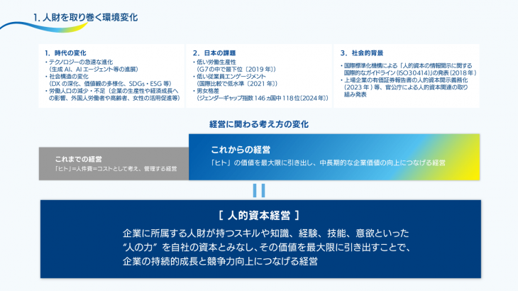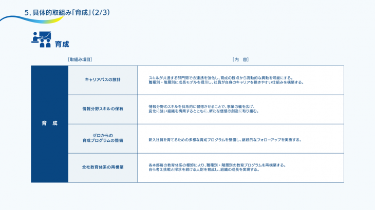 人財価値戦略では、「人的資本の拡充」「DE&I」「学び(キャリア自律・リスキリング)」「ウェルビーイング」の4つを柱に定め、3つの課題[ 確保・育成・活躍 ] へ取り組みます。