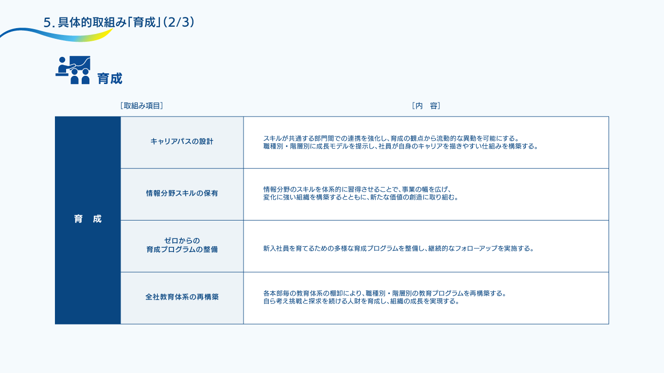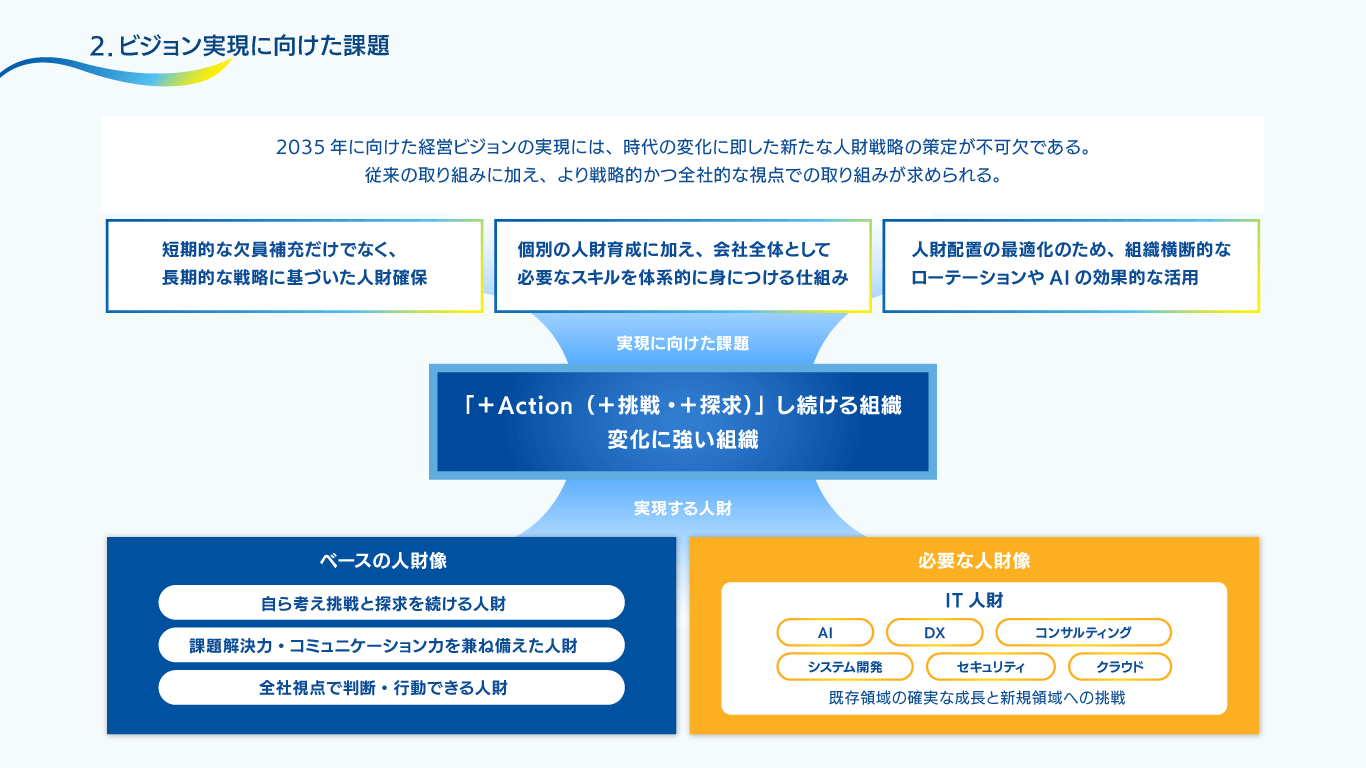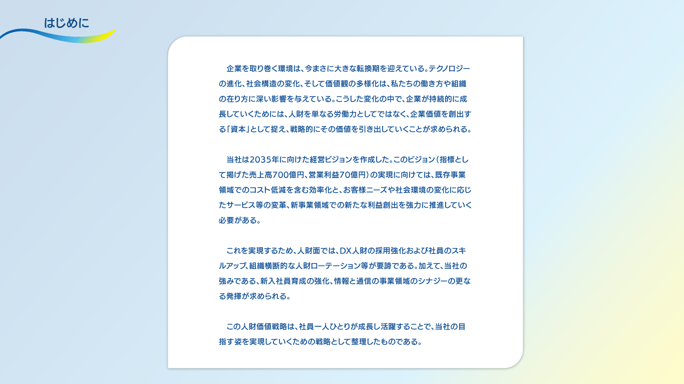 当社は、「あなたの理想」を実現するため、社員一人ひとりが成長し活躍することで、企業の持続的成長と競争力向上につなげ、みなさまから信頼される企業を目指します。