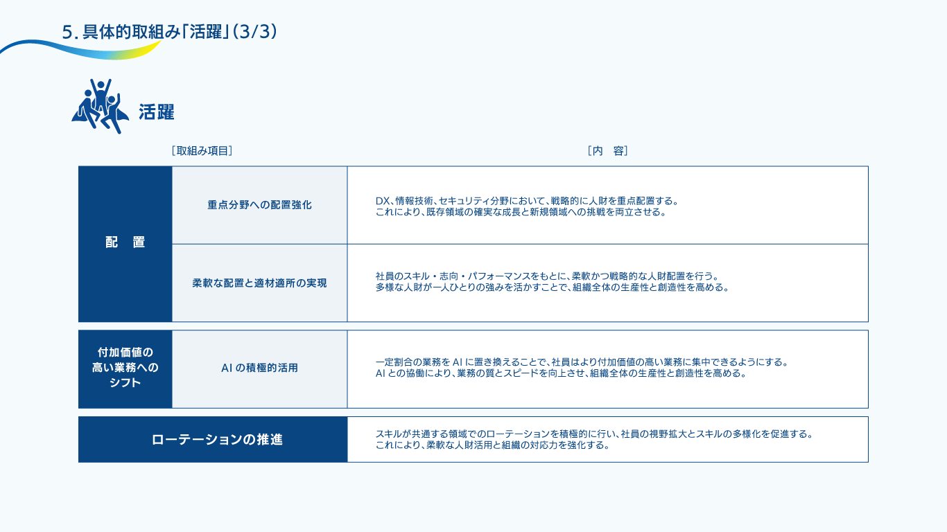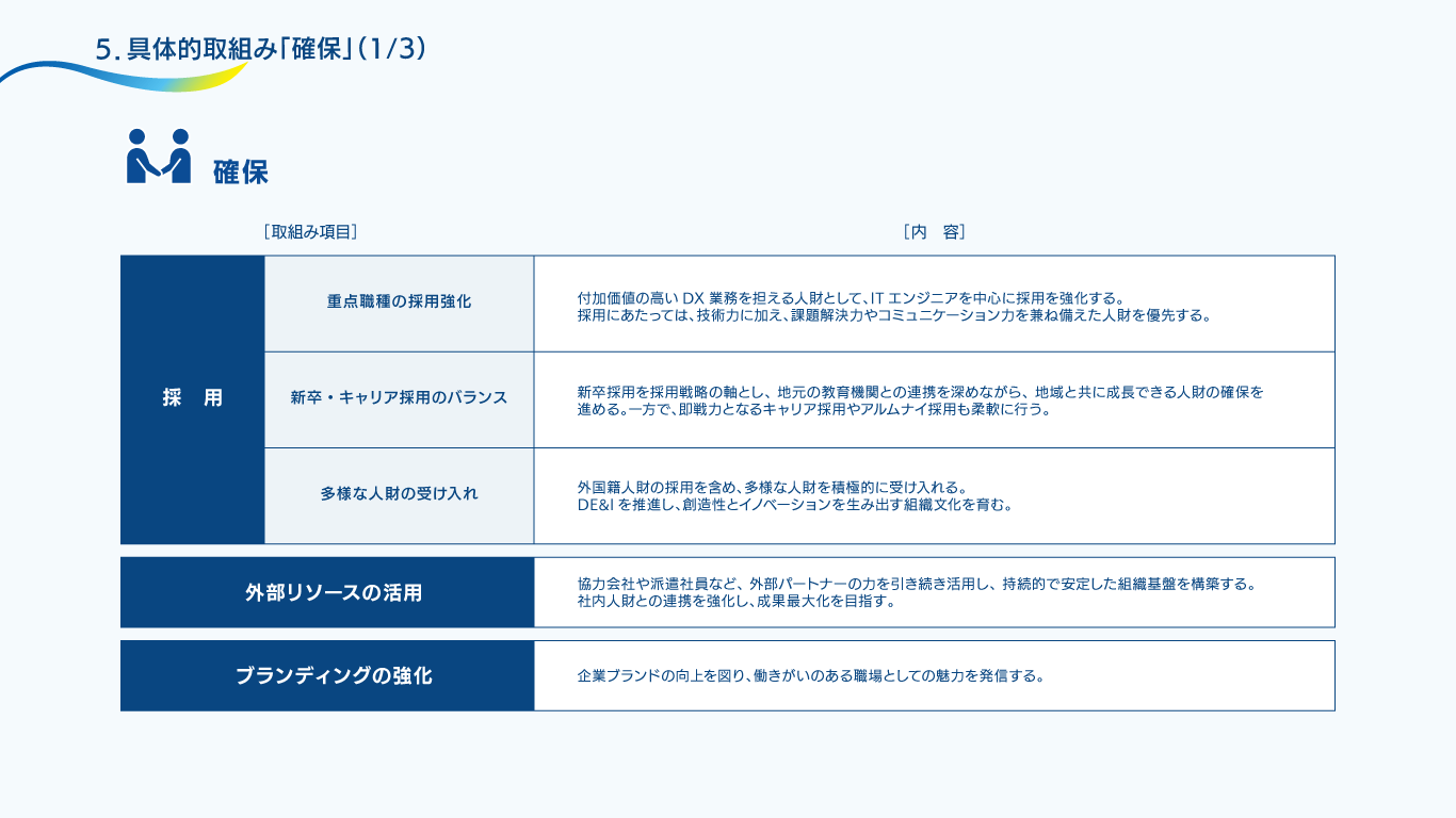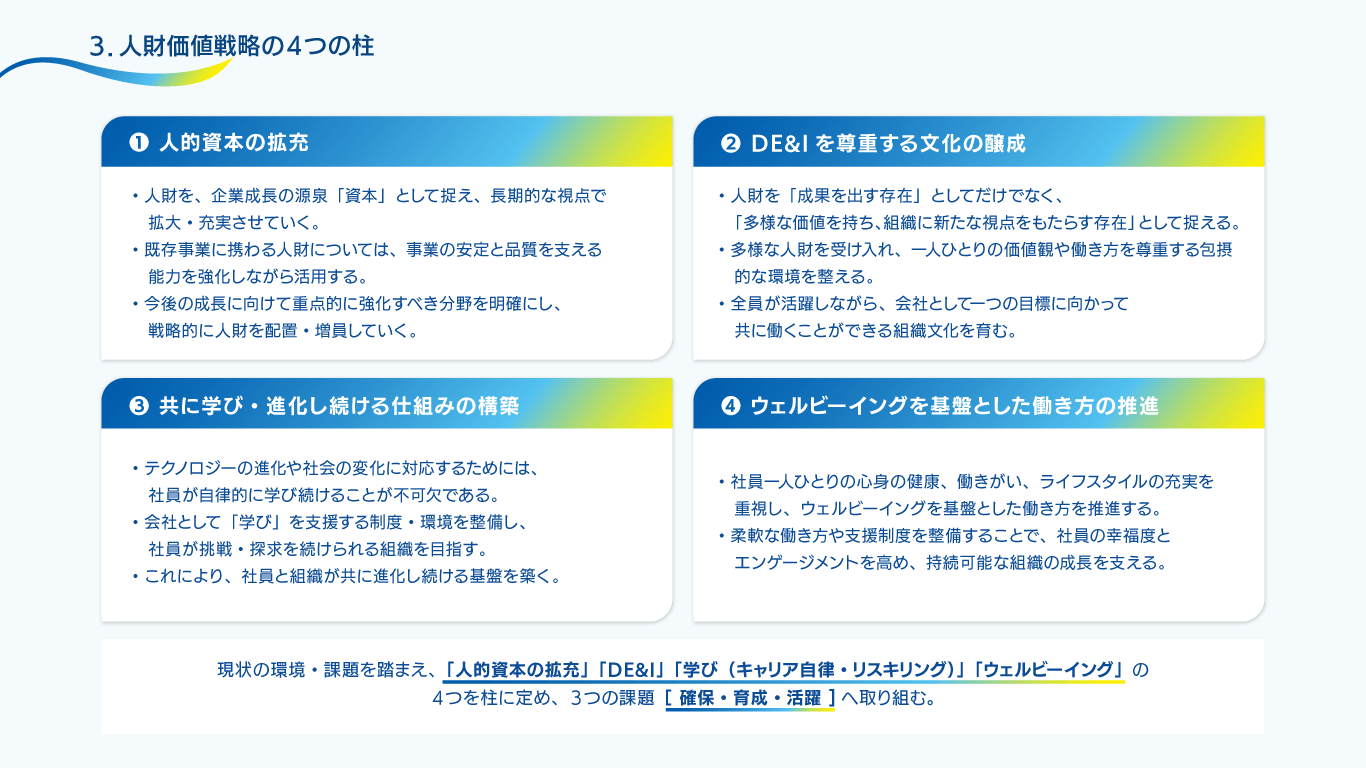 人財価値戦略では、「人的資本の拡充」「DE&I」「学び(キャリア自律・リスキリング)」「ウェルビーイング」の4つを柱に定め、3つの課題[ 確保・育成・活躍 ] へ取り組みます。