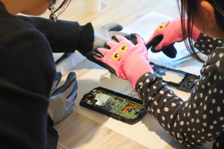 スマホ分解体験では、KDDIからスマホの部品リサイクルについて解説しました。分解作業には障害者の方が活躍していることや、スマホに含まれるレアメタルを再利用することが、途上国で働く子どもたちを過重労働から守ることにつながっていることもお伝えしました。その後、子どもたちは分解に挑戦。ドライバーやピンセットを使ってねじやモーターを取り外すなど、保護者やスタッフのサポートを受けながら真剣に作業に取り組んでいました。