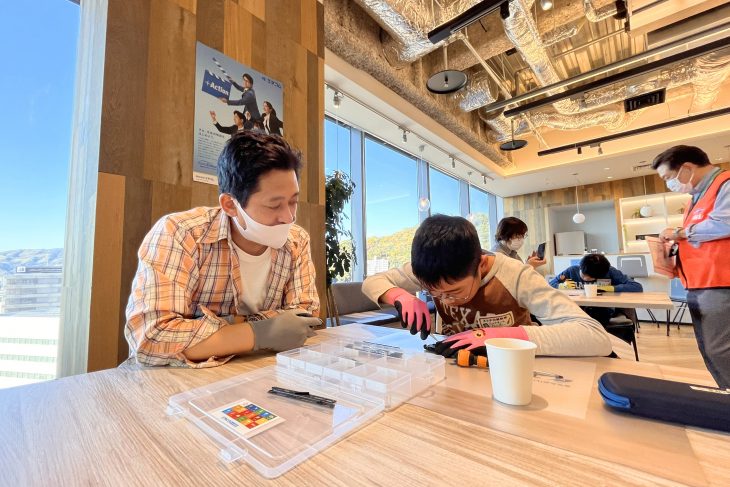 2025年11月22日、当社はKDDI中国四国総支社(以下、KDDI)と共同で「スマホ分解教室 in 広島」を開催しました。当社エキキタオフィスのコミュニケーションスペースを会場とし、午前と午後の2部制で実施。小学3~6年生のお子さんと保護者が参加し、スマホの分解作業を通してスマホ通信の仕組みやマテリアルリサイクルについて学びました。