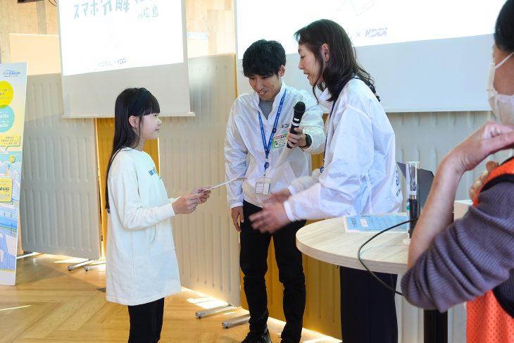教室の最後には子どもたち一人ひとりに修了証を贈呈。参加者からは「スマホの構造だけではなく、通信や光ファイバーの仕組みも理解できた」「リサイクルで学んだことをこれからの生活に役立てたい」といった感想が聞かれ、この教室が貴重な学びの場となったことが伺えました。子どもたちはクイズや分解作業に熱心に取り組み、終了後は記念撮影をするなど、終始楽しそうな笑顔が印象的でした。